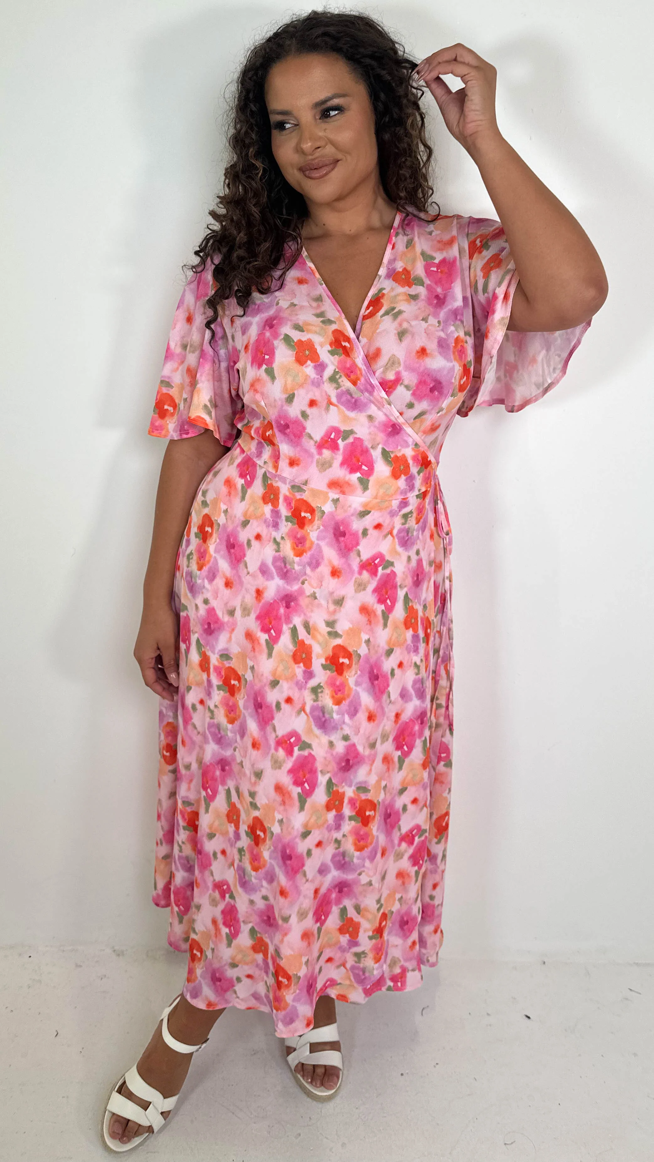 CurveWow Angel Sleeve Wrap Dress Pink Multi Floral
