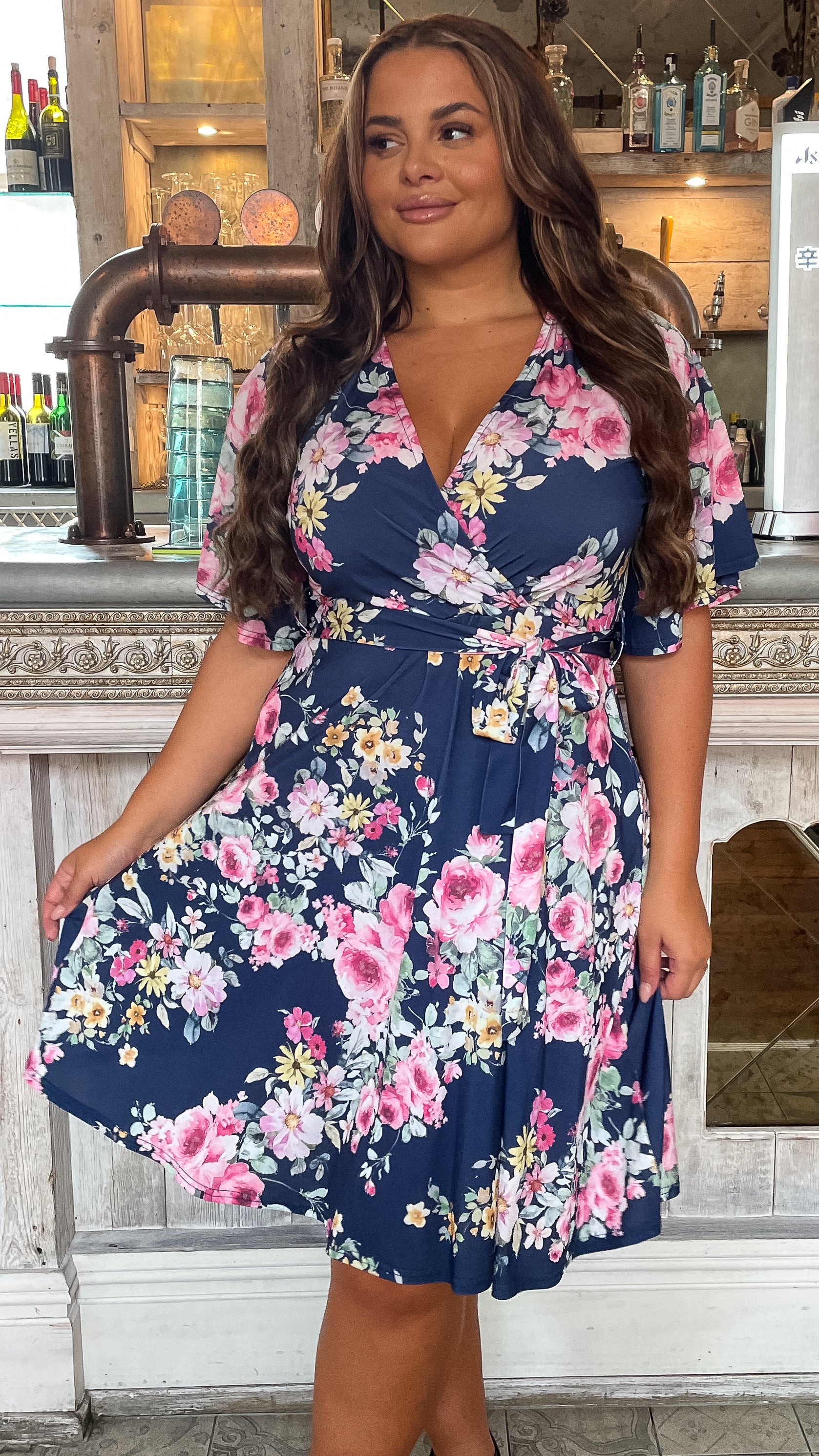 CurveWow Angel Sleeve Wrap Midi Dress Navy Floral