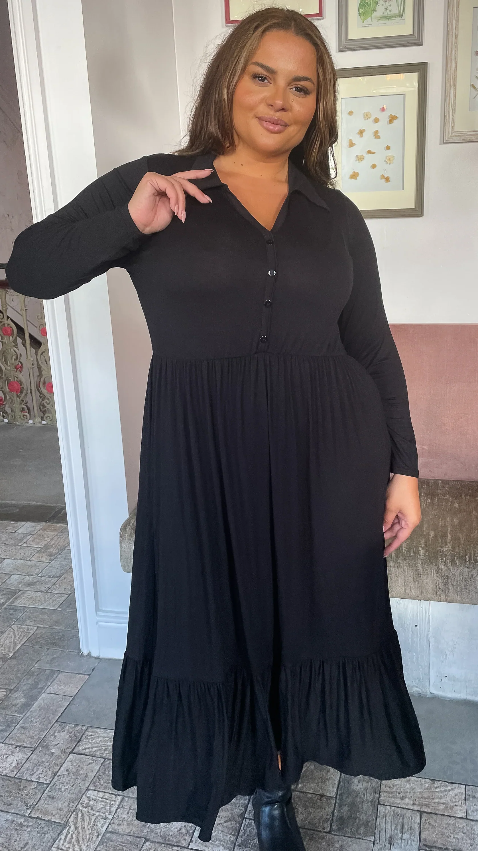 - Collared button smock dress black