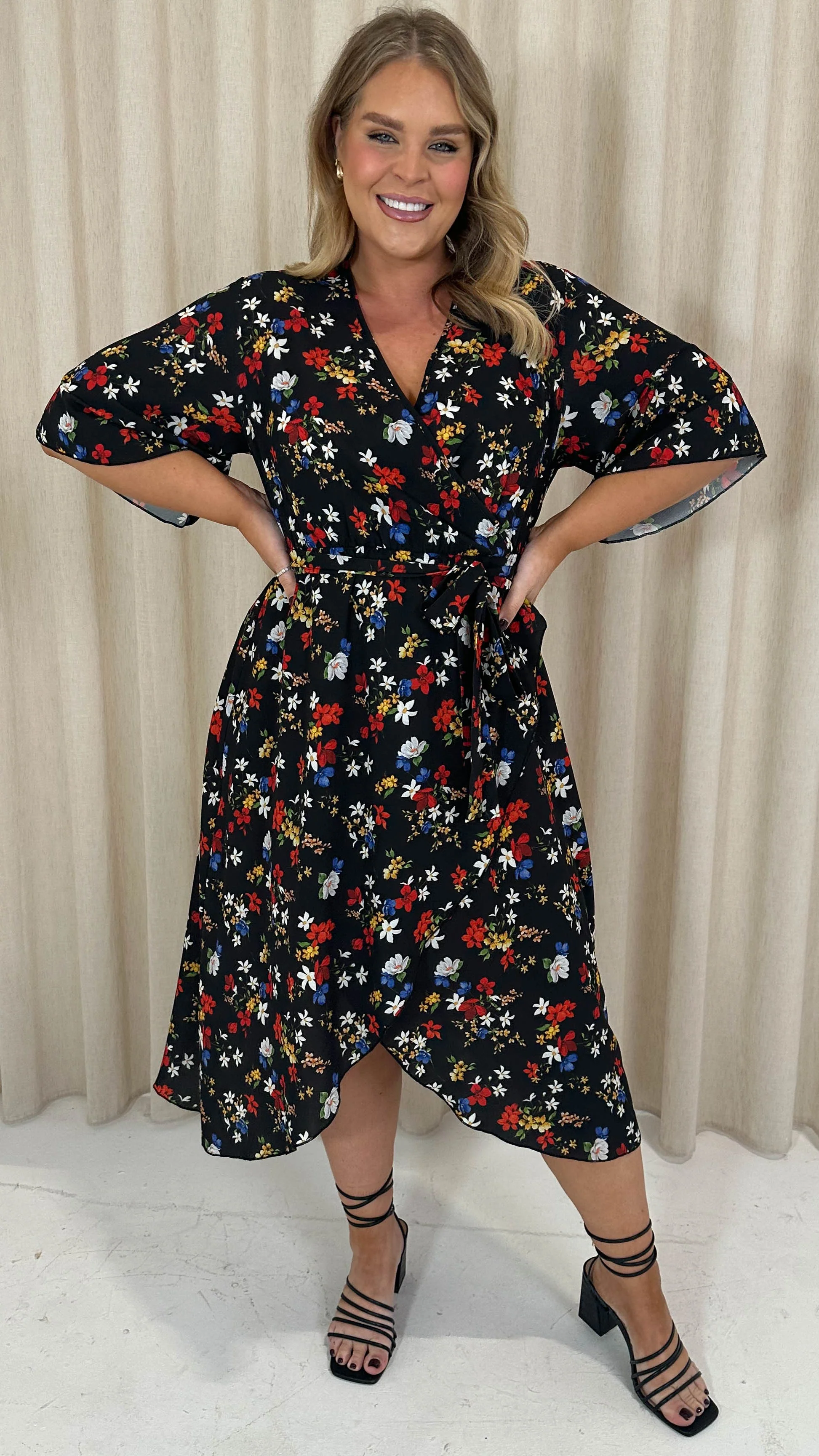 CurveWow Petite Wrap Angel Sleeve Dress Black Floral