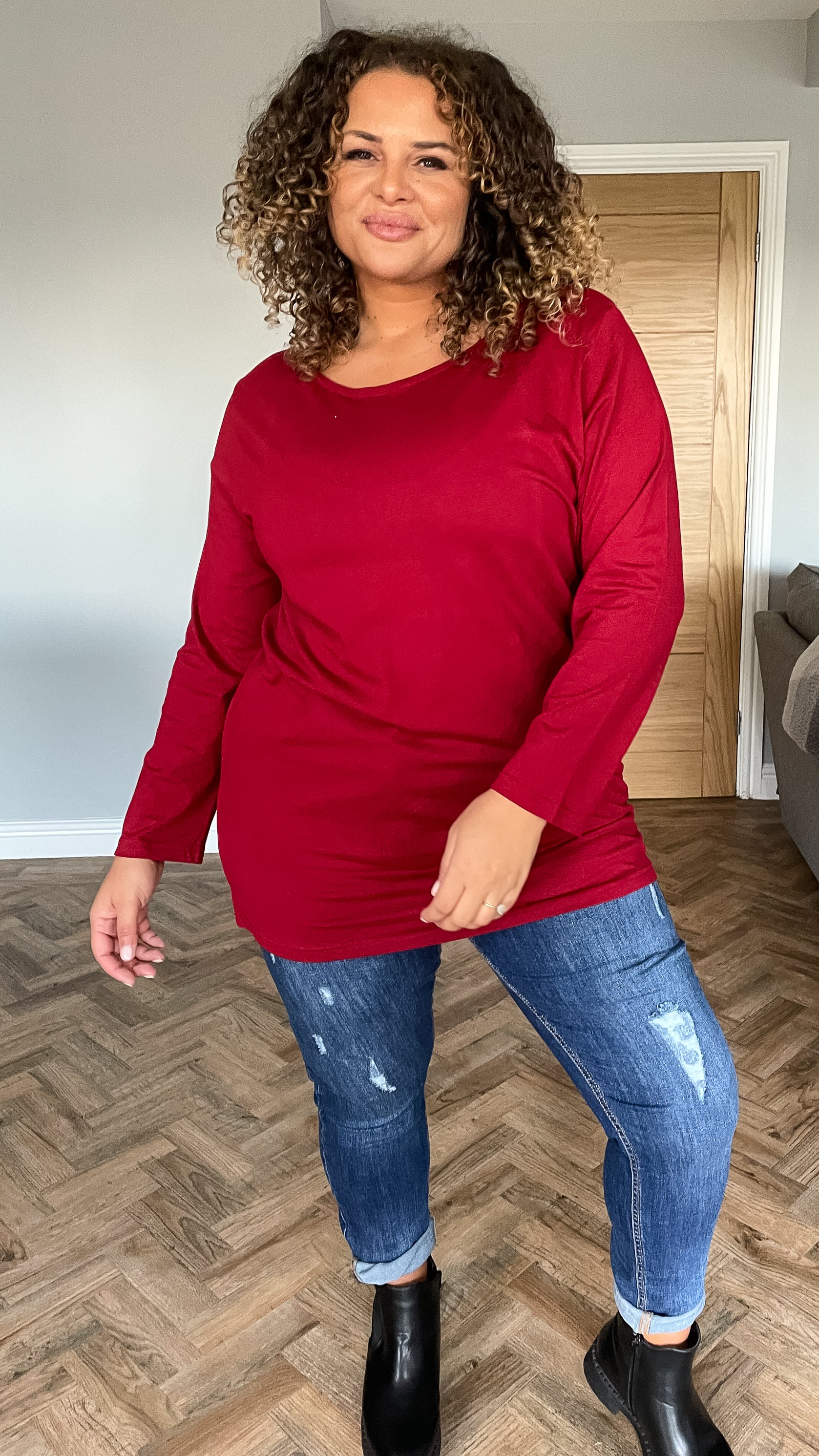 This wine long sleeved top is perfect for everyday casual wear and also adds a pop of colour to your outfit. Comfortable cotton , scoop neckline and long sleeves. Style with leggings and chunky boots for an effortlessly on-trend look you can rely on.