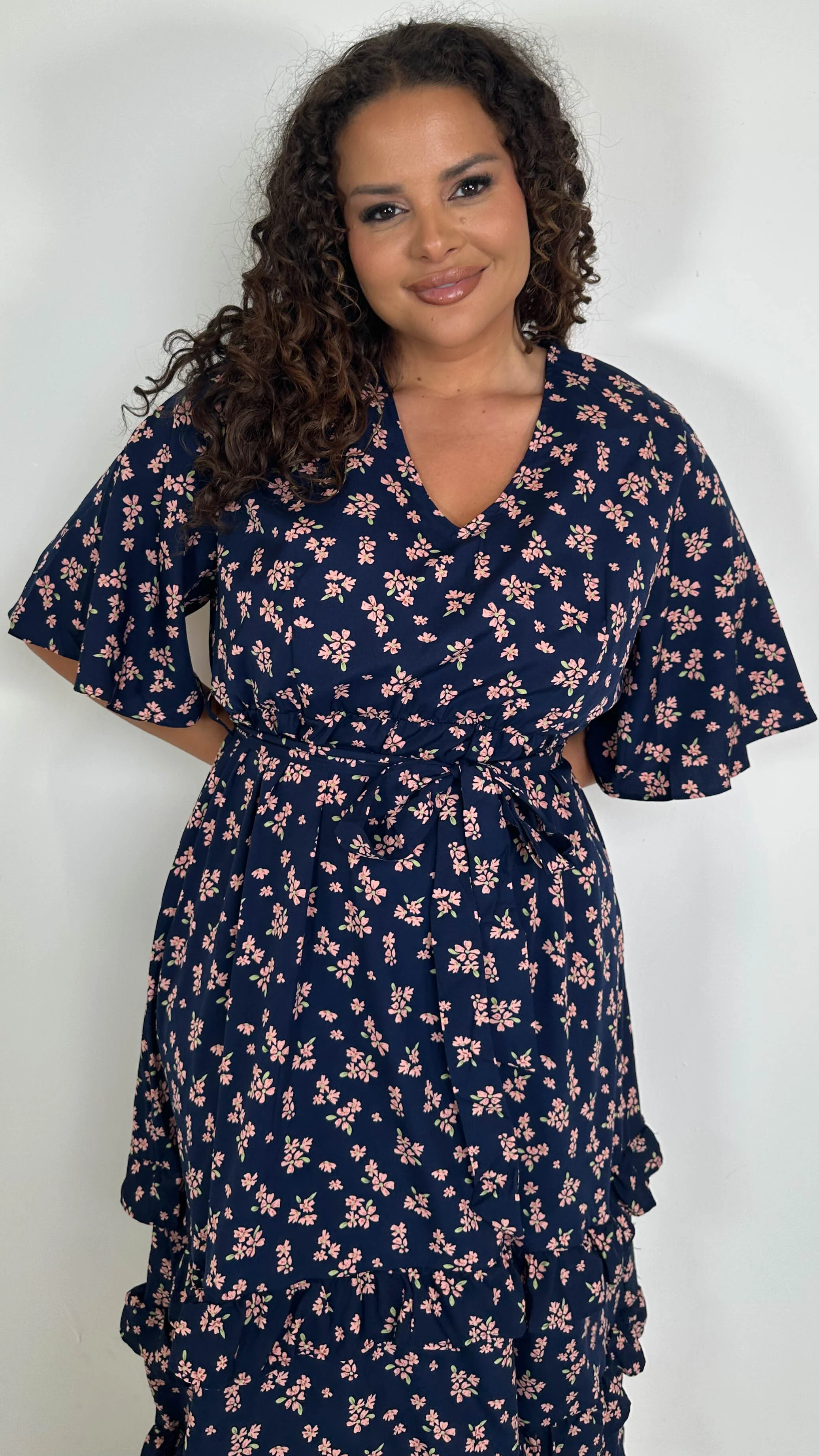 CurveWow V-Neck Ruffle Hem Floral Maxi Dress Navy Ditsy
