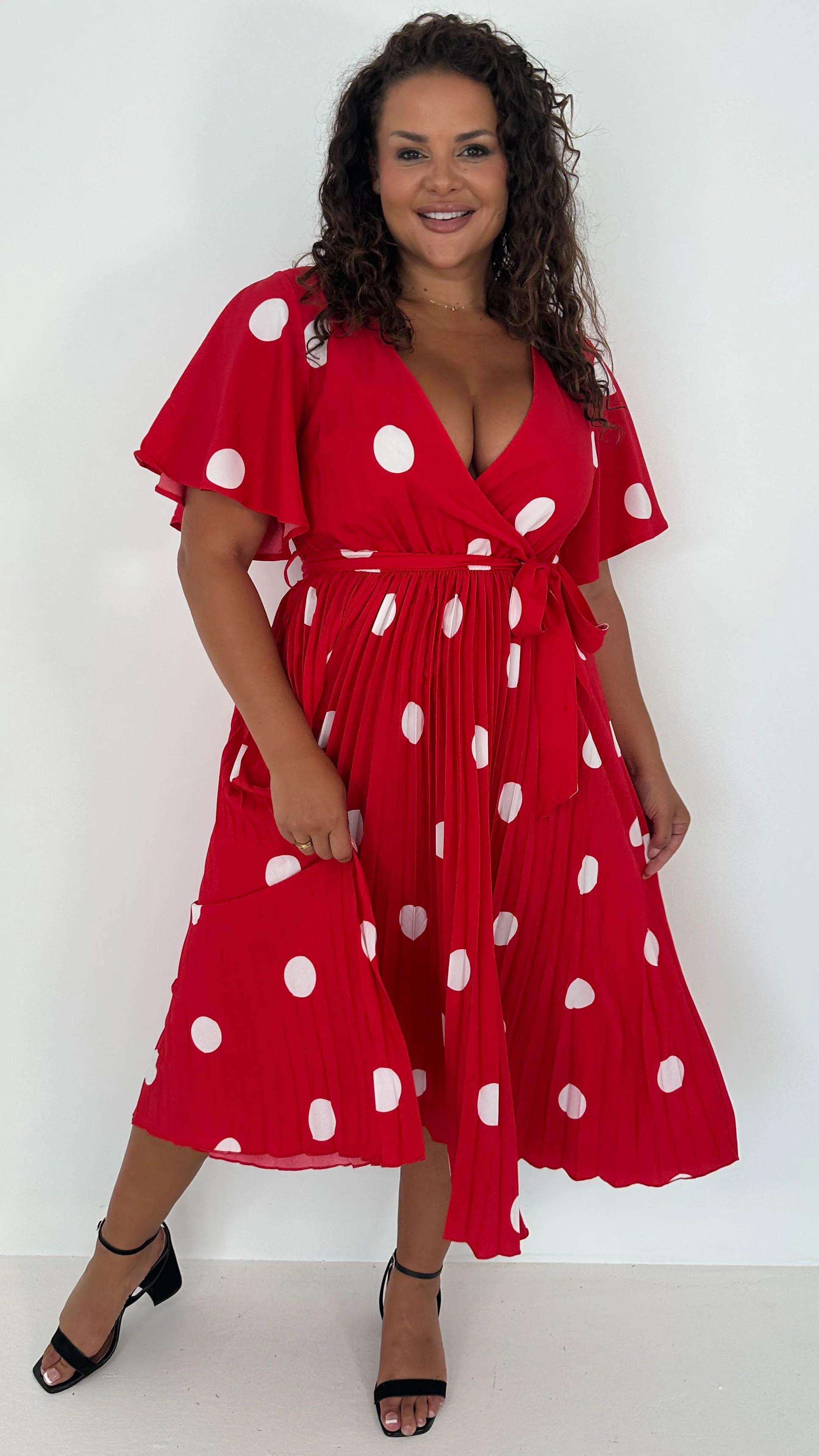 CurveWow Wrap Angel Sleeve Pleated Midi Dress Red Polka Dots